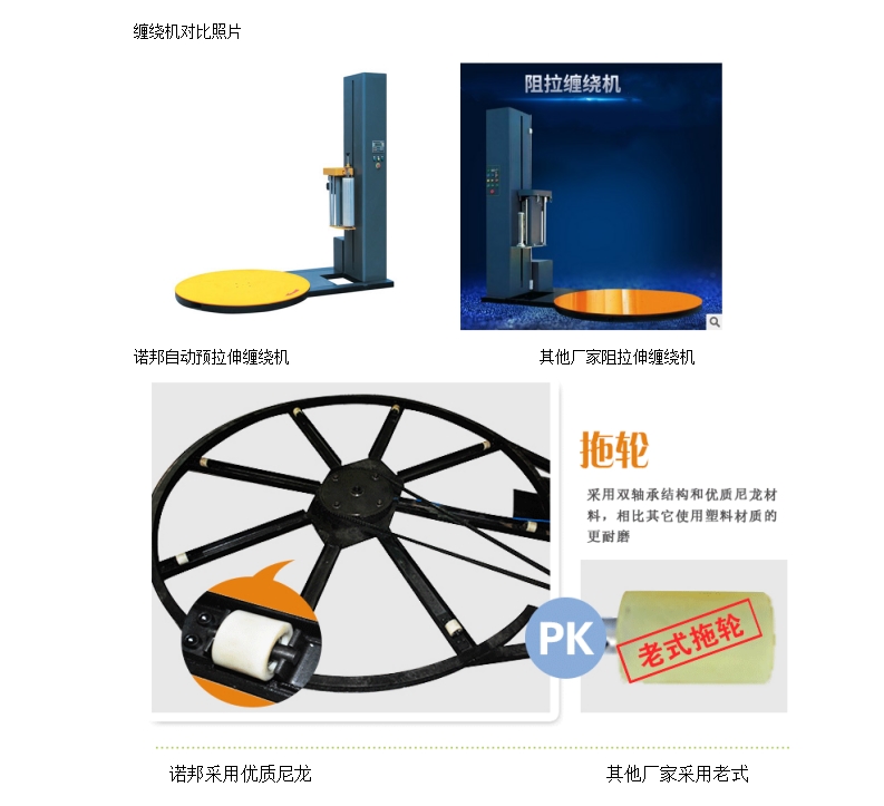 纏繞機的工作原理是將被纏繞物體放置于轉盤中央,啟動轉盤電機轉動,自然地帶動轉盤轉動,使物體實現了外圍的纏繞。與此同時升降機電機也啟動,帶動整個組合體做上下運動,達到物體高度方向的纏繞,這就實現了物體整個外表的纏繞包裝。為了能更進一步的讓用戶了解纏繞機性能,選擇適合自己公司的纏繞機設備,這里先從結構、功能和內部配置等方面,主要對托盤纏繞機包裝設備進行一下簡單的對比,希望能對您的設備選型起到作用